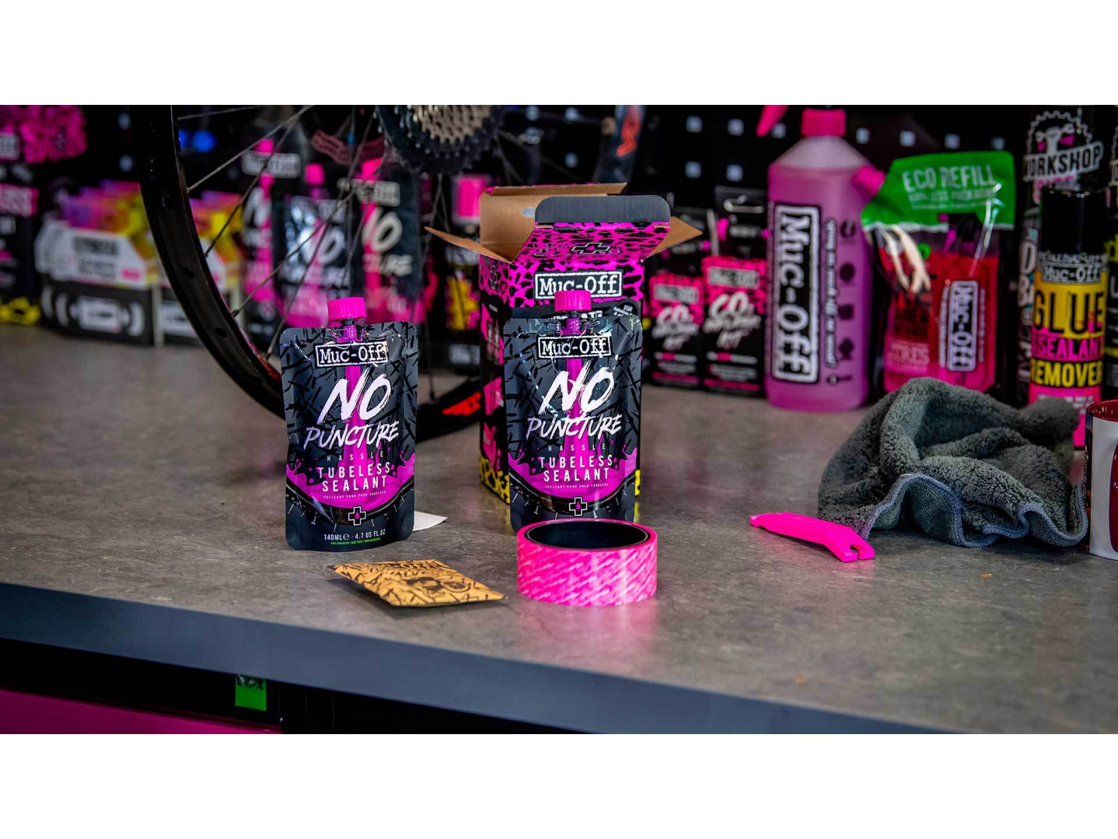 The Muc-Off Ultimate Tubeless Kit contains everything needed to get a tubeless-ready wheelset set up and ready to roll. Each Kit contains a Muc-Off Tubeless Rim Tape, Seal Patches, 2 CNC-machined black tubeless Valves and 2 pouches of No Puncture Hassle Tubeless Sealant.