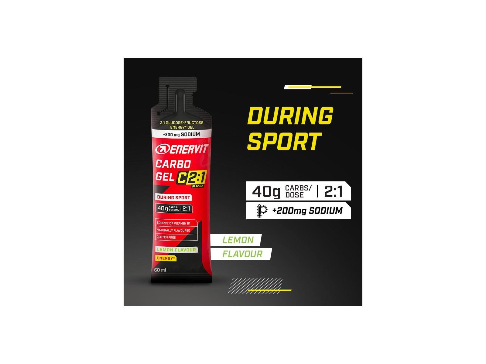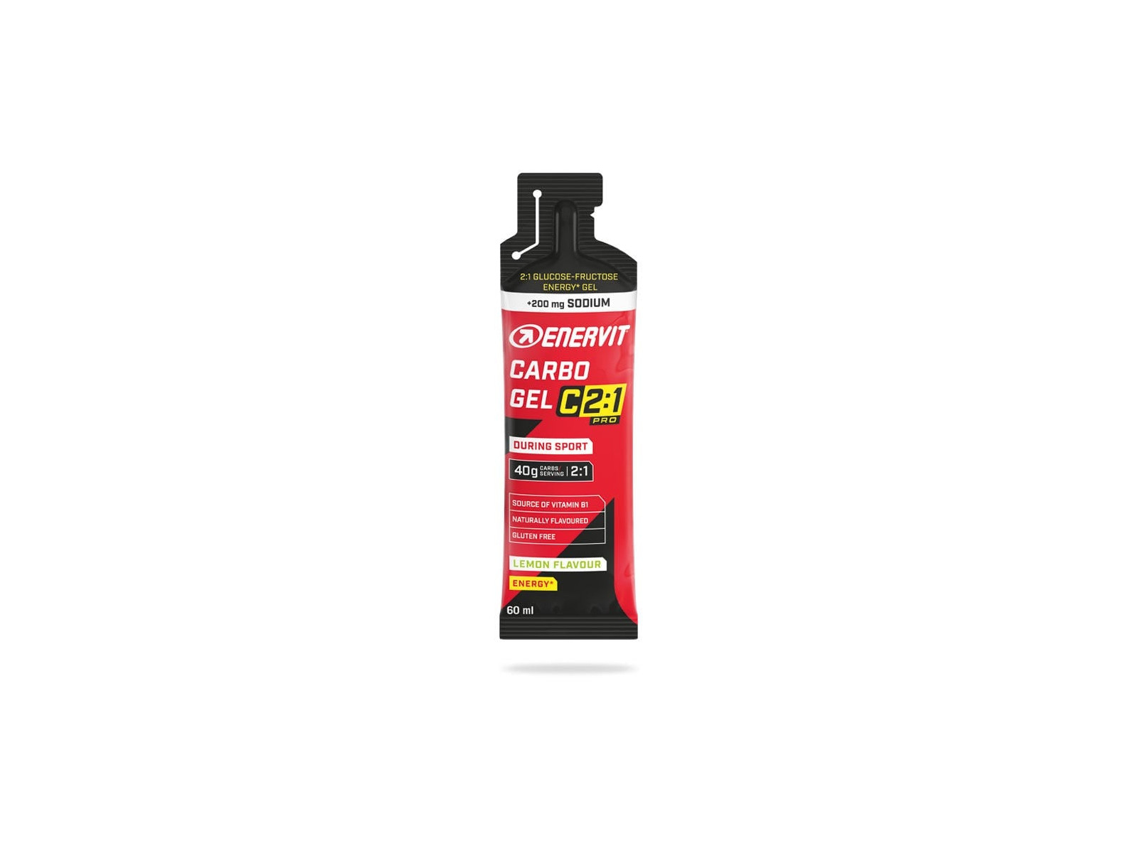 Enervit Carbo Gel C2:1PRO Lemon ar nātriju ir ekskluzīvs enerģijas gels ar maltodekstrīnu un fruktozi 2:1 proporcijā. Ņemot vērā maigo citrona garšu, 200 mg nātrija, lai karstās dienās uzturētu vajadzīgo hidratācijas līmeni, un samazināto saldumu, neskatoties uz augsto enerģijas blīvumu, Carbo Gel C2:1PRO nodrošina 40 g ogļhidrātu.