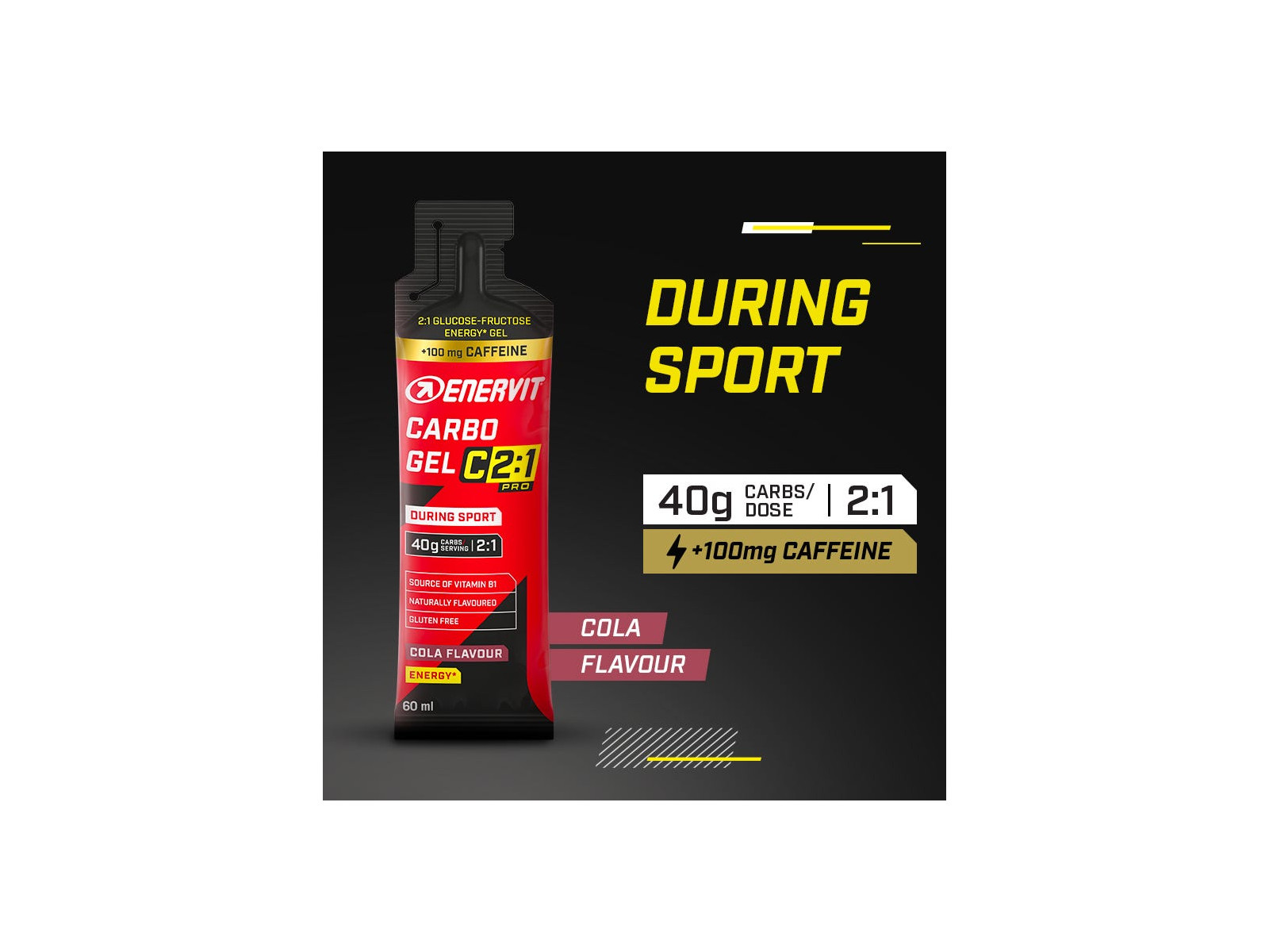 Enervit Carbo Gel C2:1PRO Cola ar kofeīnu ir ekskluzīvs enerģijas gels ar maltodekstrīnu un fruktozi proporcijā 2:1. Ņemot vērā kolas garšu, 100 mg kofeīna, kas palīdz uzturēt jūs sacensību pēdējās fāzēs, un samazināto saldumu, Carbo Gel C2:1PRO nodrošina 40 g ogļhidrātu, neraugoties uz tā lielo enerģijas blīvumu.